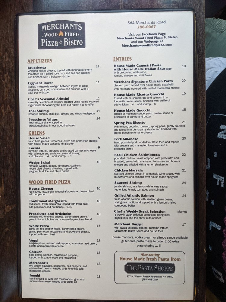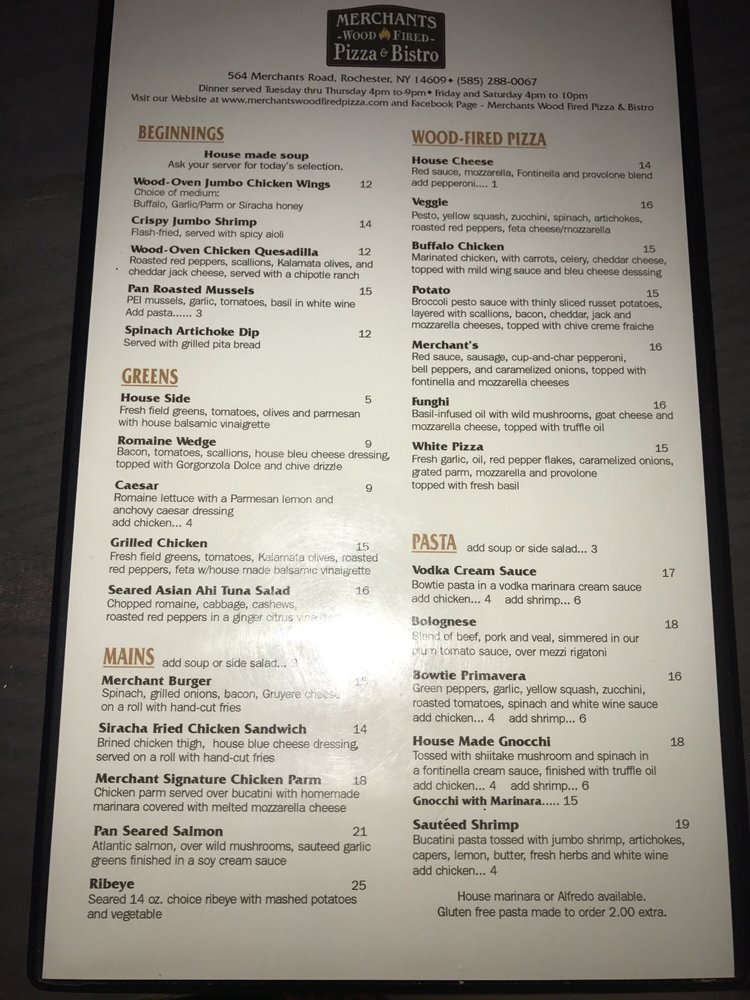 Welcome to Merchants Wood Fired Pizza & Bistro, where American classics are elevated to perfection. Located at 564 Merchants Rd in Rochester, NY, this restaurant offers a diverse menu featuring wood-fired pizzas, hearty salads, and more. Whether you're dining in, taking out, or having it delivered, Merchants Wood Fired Pizza & Bistro has got you covered. With amenities like outdoor seating, free Wi-Fi, a full bar, and even TV for entertainment, this spot is perfect for groups, families, or a casual dinner date. The attentive waitstaff and cozy atmosphere make dining here a delightful experience. Don't miss out on their delicious pizzas cooked in a wood-fired oven, creating a crispy crust and delicious smoky flavor. Merchants Wood Fired Pizza & Bistro is a must-visit for those craving a satisfying and memorable dining experience.